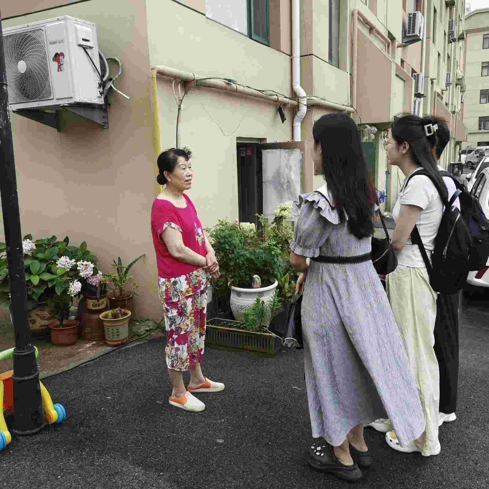 圖為社會實踐隊隊員與社區阿姨交流的場景。
