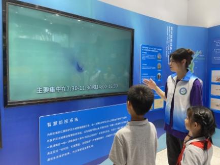 在江豚書屋,實踐團成員鈕奕樺以科普宣講的形式向小朋友們介紹了江豚知識,包括江豚的外形特征、生活習性、食物喜好、活動范圍、種群現狀、保護及救治措施等。在科普課堂上,小朋友們目不轉睛地盯著大屏幕,積極地舉起小手回答問題,表現出了對江豚濃厚的興趣。