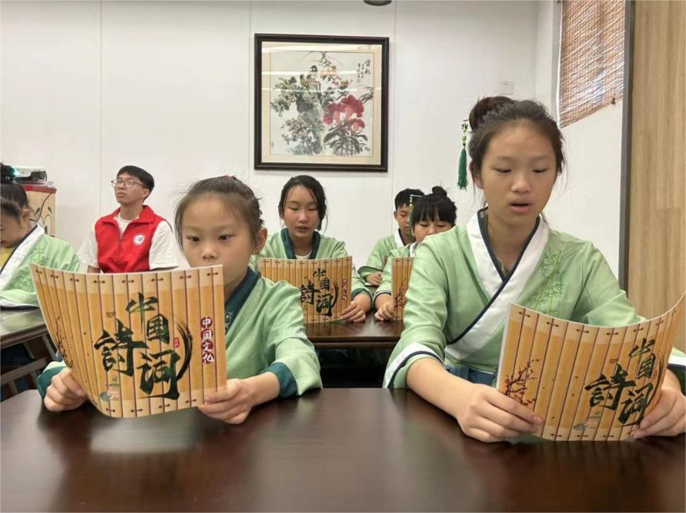 圖為小朋友們學(xué)習(xí)典故并朗誦古詩《飲酒》
