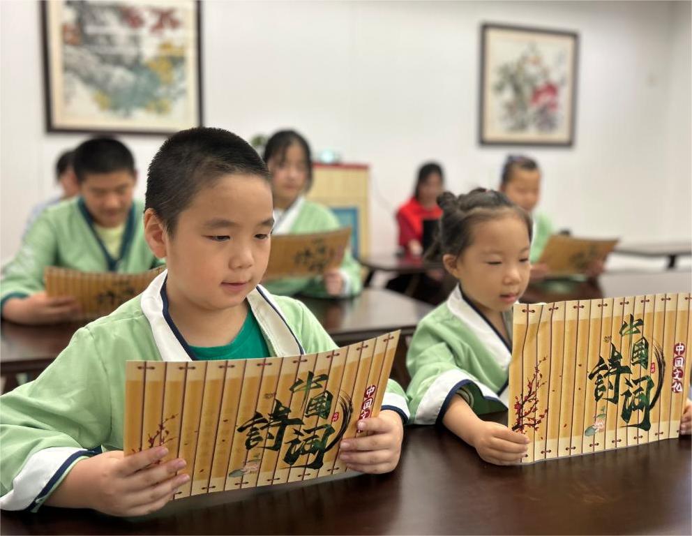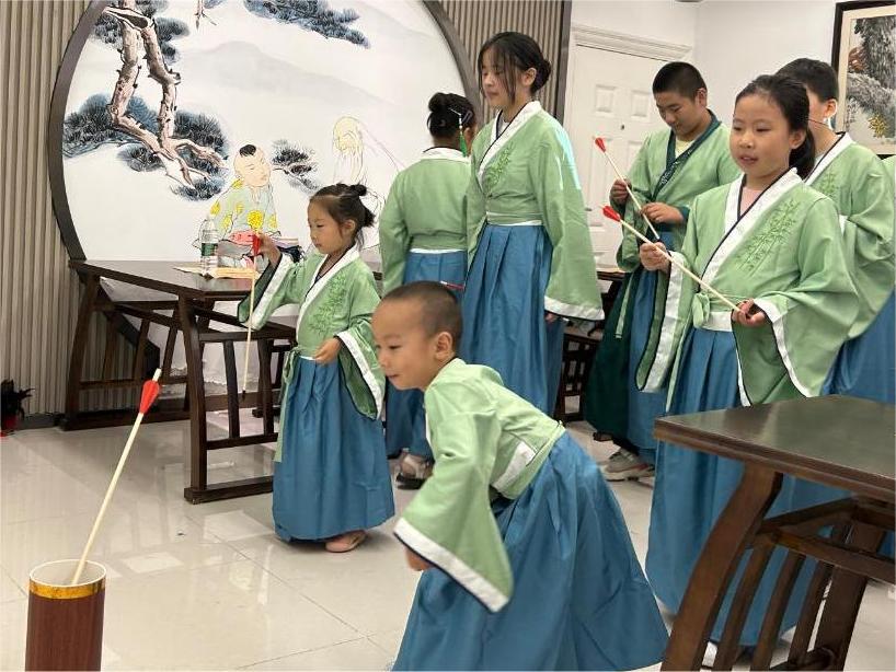 圖為志愿者為小朋友們講解古代游戲——投壺