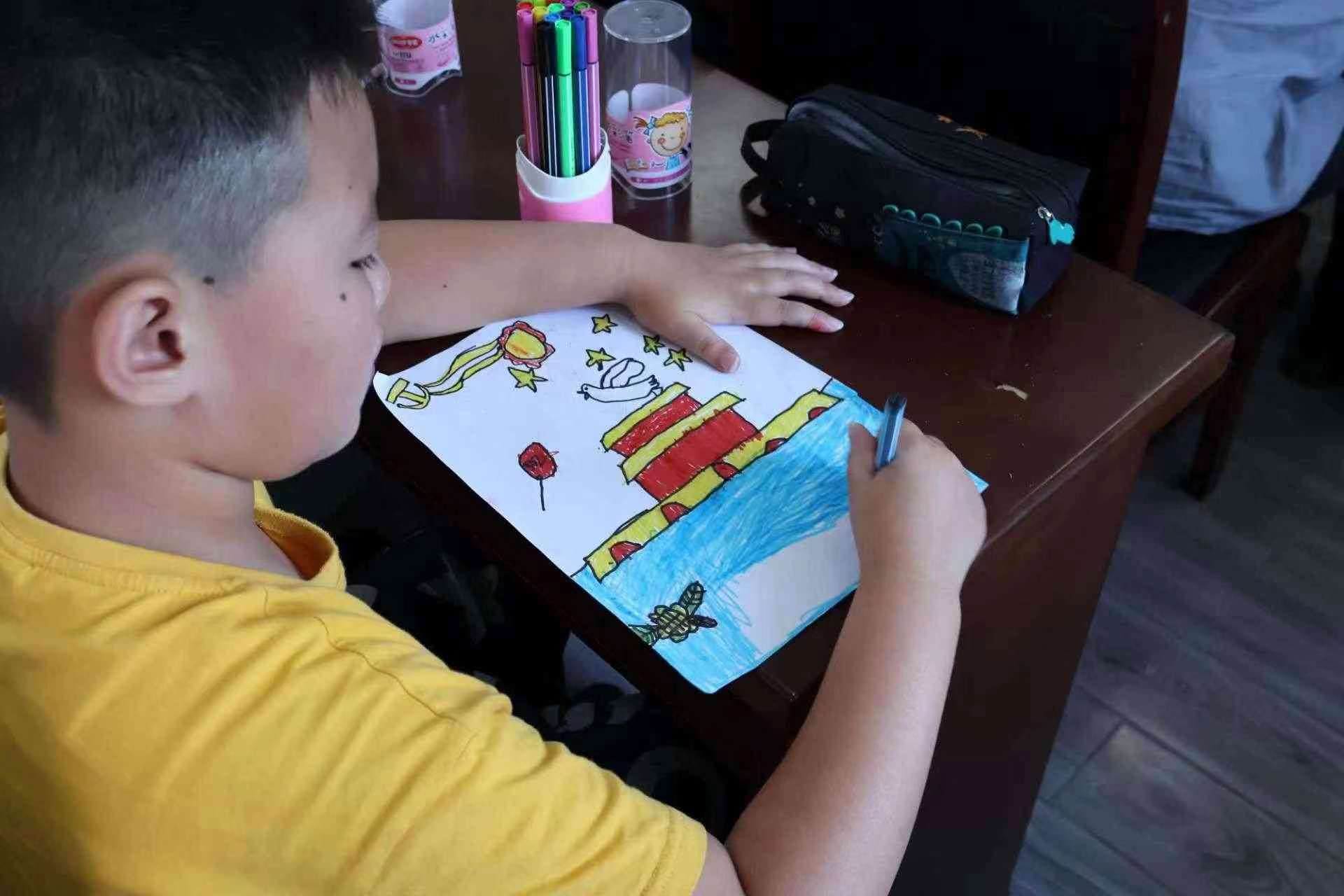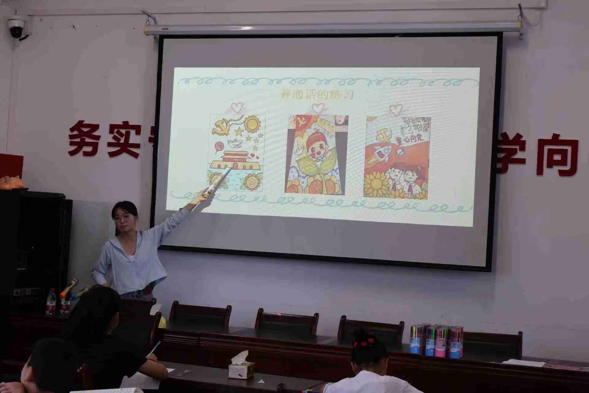 實(shí)踐團(tuán)成員們以藝術(shù)課堂為載體,開展藝術(shù)普通話課堂,帶動(dòng)小朋友辨音識(shí)字,小朋友們聽的很認(rèn)真,踴躍的舉手發(fā)言,一個(gè)音節(jié)一個(gè)音節(jié)的朗讀普通話,在自己的畫作上寫下“” 我愛祖國“” “ 普通話宣傳”等字眼,
