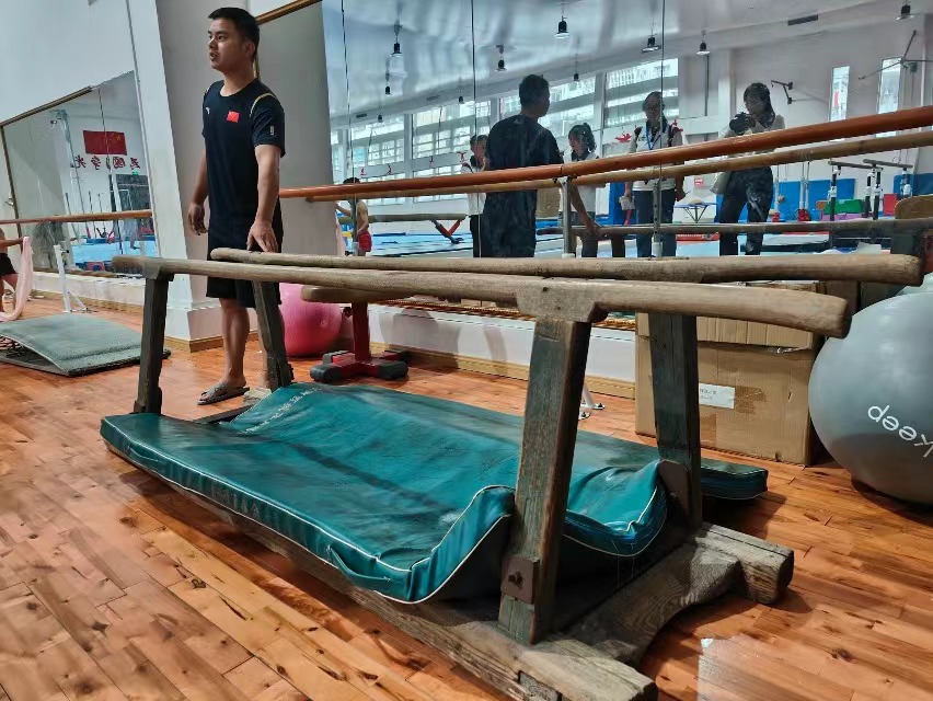 圖為劉教練向團(tuán)隊介紹榕江第一代體操教練制作的已有60多年歷史的雙杠。黃杰 攝