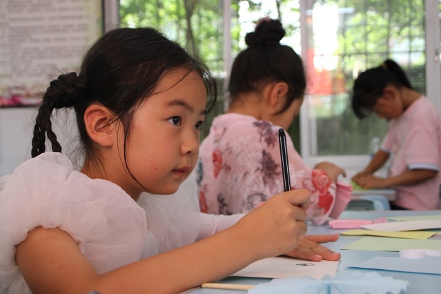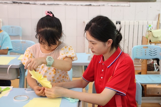活動中,志愿者們通過幽默風趣、簡單易懂的語言,以視頻展示、現(xiàn)場演示等多種方式,向小朋友們講解手工制作步驟、示范制作要領。在志愿者的指導下,小朋友們制作出了精美的貼畫書簽和紙扇。課堂上氣氛熱烈,孩子們熱情高漲。