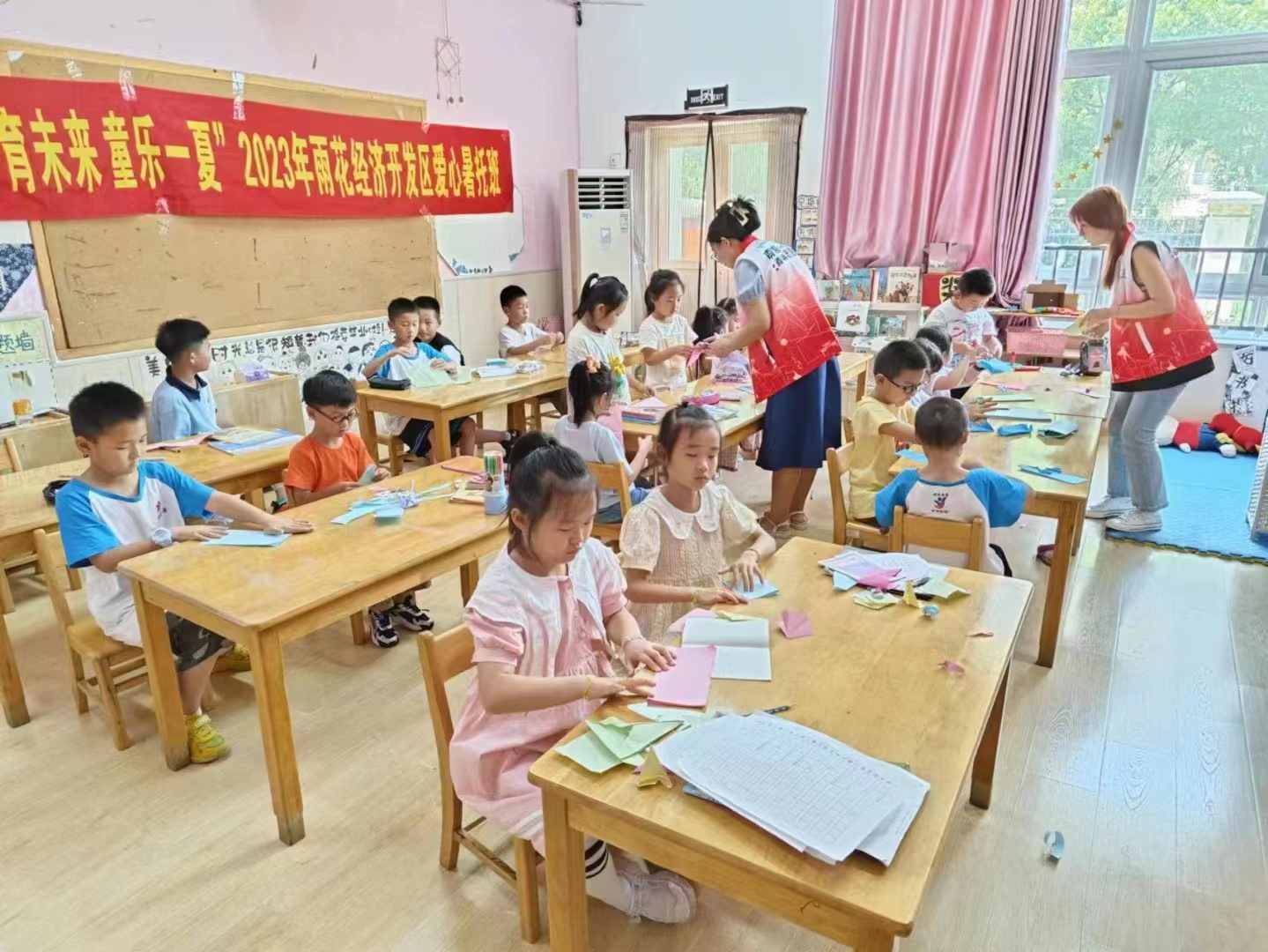 木色木香的課桌旁,孩子們揮動著手中的彩色卡紙,眼神中閃爍著光芒,細細聆聽著團隊成員的講解,跟著他們的動作,用雙手巧妙地將一張張卡紙變幻成各種形態的動物和飛機,并用彩筆勾勒出自己喜歡的圖案。