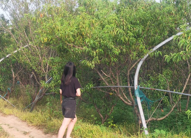 實踐隊員觀察到,大部分的桃林似乎打理的并不細致,桃林內長滿雜草,六七月份正是桃樹結果的時節,或青或紅的桃子綴在綠葉之間,但桃子個頭大小不一,不少桃子都有蟲子啃咬的痕跡,品相并不算好。
