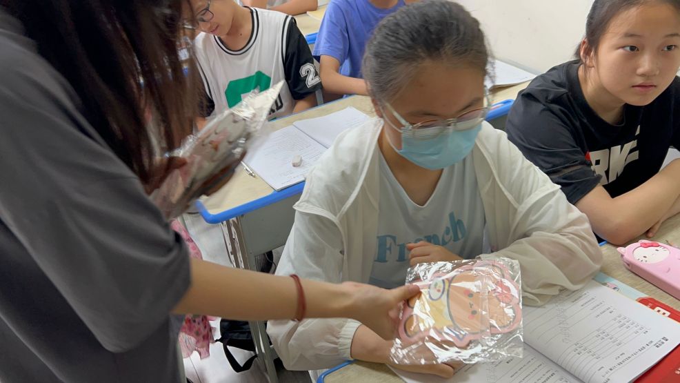 圖為實(shí)踐團(tuán)成員給同學(xué)們發(fā)放小紀(jì)念品