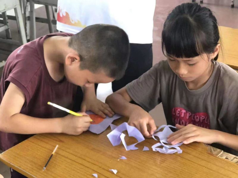 【嶺南師范學院教育科學學院07月15日訊】(通訊員:“星火鄉傳”社會實踐隊)7月15日下午,在遂溪縣樂民鎮埠頭小學一二年級合班班級課室里,“星火鄉傳”社會實踐隊隊員陳誠至給當地一二年級的小學生在上一堂剪紙手工課。