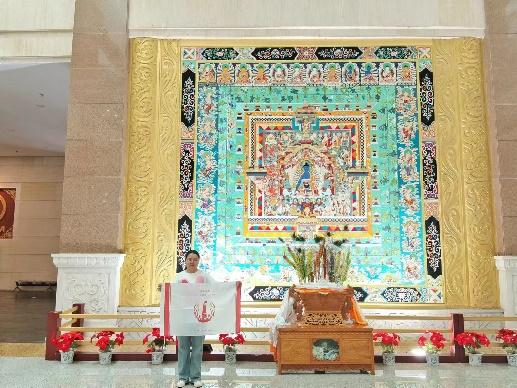 走進大廳就可以看到一巨幅藥師佛、藥王及藥王城。藥王曼杰拉—— 藥師琉璃光佛是釋迦牟尼的化身,他曾在藥王城內為諸菩薩和外道諸神傳講醫學。據藏醫經典敘述:藥王城是一座正方形無量宮。宮墻五層,共有四門,由四大天王守護。無量宮富麗堂皇,光彩奪目。陽光普照的城南山上,長滿主治寒性病的各種熱性藥物;城北生長著主治熱性病的各種寒性藥物;城東生長著七種詞子;城西生長著六種良藥及寒水石、五靈脂,還有溫泉和五種藥水。藥林上空,群鳥歡歌;藥林四周,軀體內存有佳藥的象、熊等瑞獸伏臥。無量宮正中陳放著鑲嵌有各種寶石的寶座,寶座由神獅、神象、天馬、鯤鵬、孔雀馱載,座上端坐著正在傳醫學的藥王曼杰拉——藥師琉璃光弗。