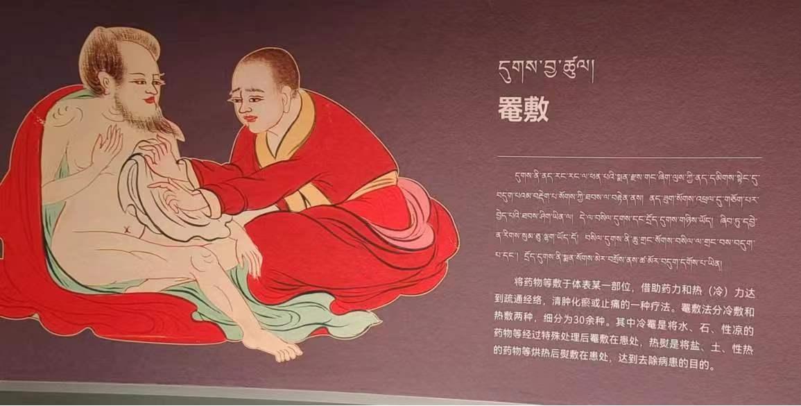 在藏醫養生展廳中,藏族人民有不同的療法來應對疾病和生活中的小病小痛。如火灸療法,涂擦療法,熏香療法,岱瓦,罨敷等。其中較為有特色的就是熏香療法,岱瓦,罨敷。