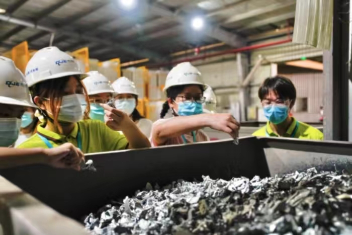 移步產(chǎn)業(yè)園展廳中,講解員向?qū)嵺`隊(duì)隊(duì)員們揭曉了廢棄電器電子產(chǎn)品的“內(nèi)部秘密”,破舊的外殼下是各種金屬與非金屬零配件。講解員告訴實(shí)踐隊(duì)隊(duì)員這些零配件即將迎來它們的第二次“生命”,在被拆解后,它們會(huì)依據(jù)不同材料進(jìn)行分類,送至流水線進(jìn)行再生利用。在賦予這些廢棄物全新形態(tài)時(shí),不僅降低產(chǎn)業(yè)的碳排放量,還減輕了重金屬污染,減少了固體廢物產(chǎn)生,真正實(shí)現(xiàn)了綠色低碳循環(huán)處理。