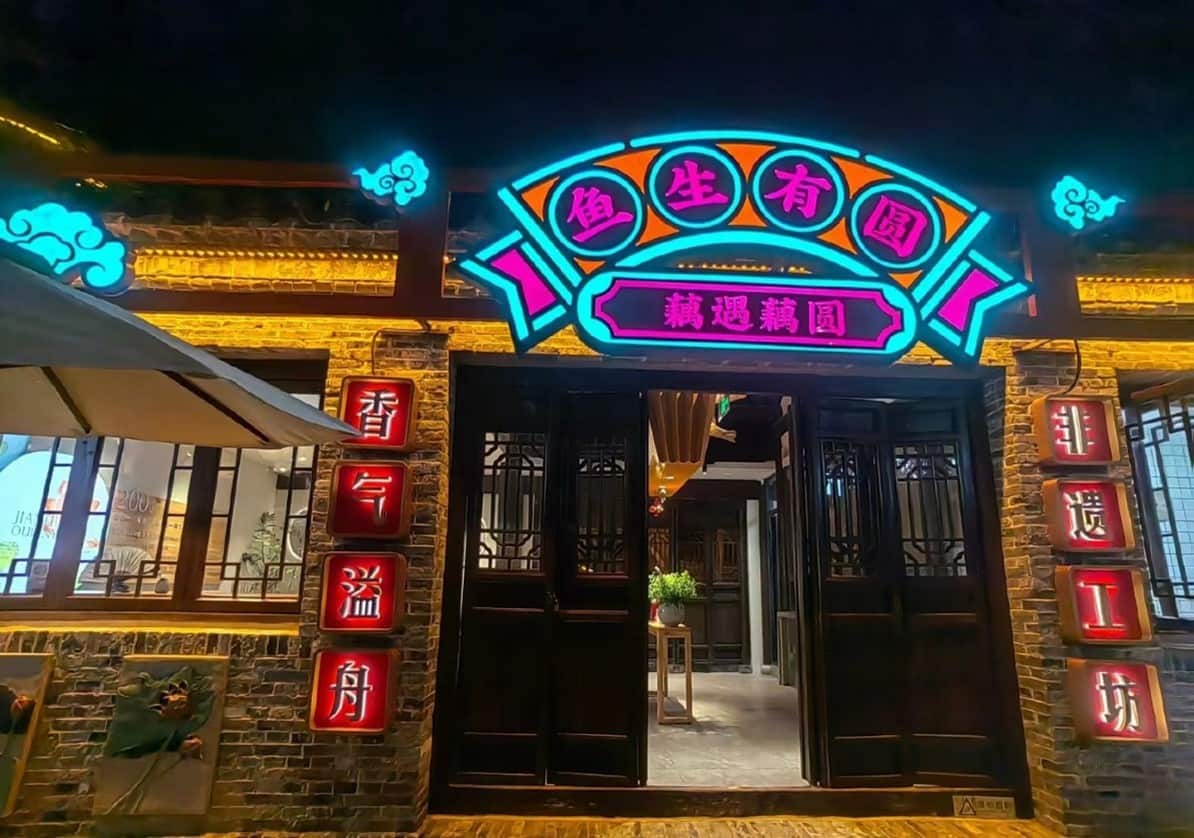 從2019年開始,九龍口以有著600多年歷史、淮劇前身的發祥地和興盛地的“沙莊古村”為原點,打造以淮劇為主題的沉浸式文旅融合街區。在這里進行著各種劇目和表演形式的創新,從以前的“慷慨悲歌”到如今的“自在喜樂”,還是那悠揚的調調,唱出了難以割舍的“鄉情”,唱出了浩渺湖水的“深情”,唱出了時尚國潮的“激情”,也唱出了新時代美好生活的“熱情”。 一次次的創新不斷為鄉村振興、推動經濟社會高質量發展注入新活力。