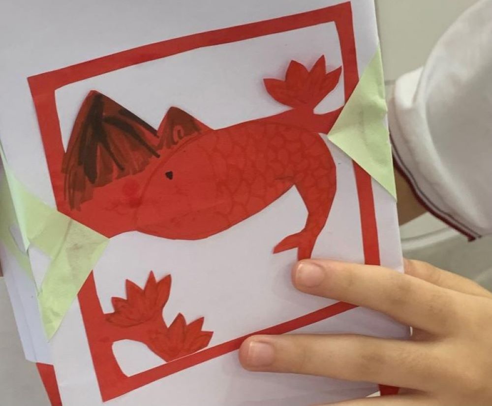 圖2 學(xué)生展示其創(chuàng)作的圖樣寓意為連年有余、山水花鳥(niǎo)