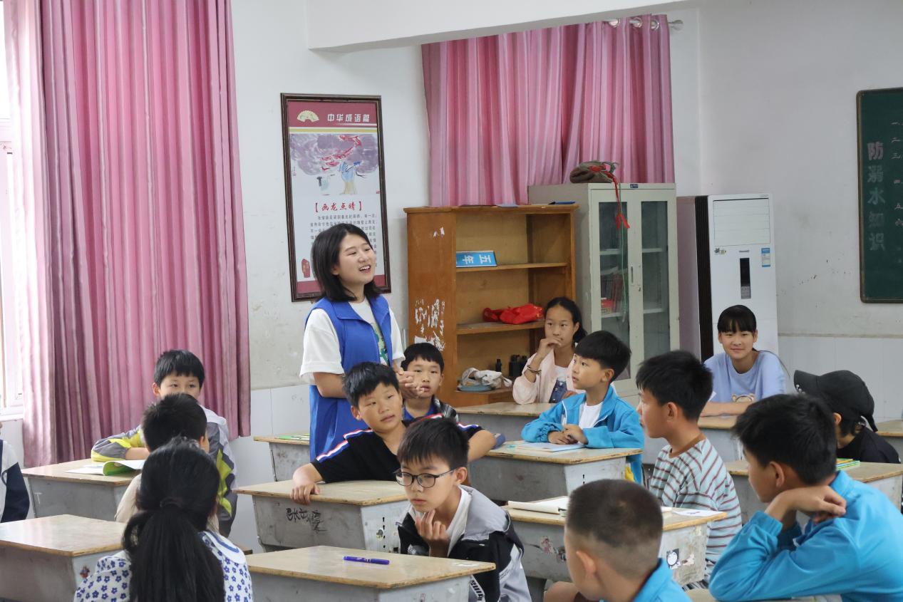 迎新結束后,支教活動正式開始。第一堂課是團隊成員葉雯慧為同學們帶來的音樂課。在實現鞏固拓展脫貧攻堅成果同鄉村振興有效銜接之年,她選擇了歌曲《萬疆》,“我何其幸,生于你懷,承一脈血流淌”歌曲傳達出了中國人民的民族自豪感,復興路途道阻且長,然我國人民兢兢業業,勤耕不輟,迎難而上,再造盛世。如今山河無恙,國泰民安,便是源于這樣的民族凝聚力。她希望通過音樂增強同學們的民族自豪感,厚植愛國情懷。在課堂上,團隊成員向同學們介紹了這首歌曲的背景和意義。她說:“這是一首歌頌祖國的歌曲,歌詞中表達了對家鄉的熱愛和對未來的美好憧憬。通過唱這首歌,你們可以感受到家鄉的美麗和祖國的偉大。”團隊成員用簡單明了的方式教授歌曲,引導同學們跟著旋律唱起來。同學們積極參與,用清澈的嗓音唱出了《萬疆》的氣勢恢宏和音韻悠長。歌聲充滿了質樸真摯的愛國情,讓整個課堂洋溢著溫馨和感動。通過這堂音樂課,同學們不僅學會了一首美妙的歌曲,也感受到了華夏大地于霞光中綻放出的耀眼光芒。他們還把歌詞記在了紙上,課間休息時,總能在走廊聽到教室內傳來“紅日升在東方,其大道滿霞光......”的朗朗歌聲。