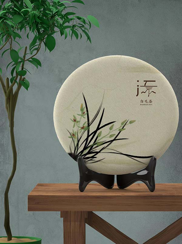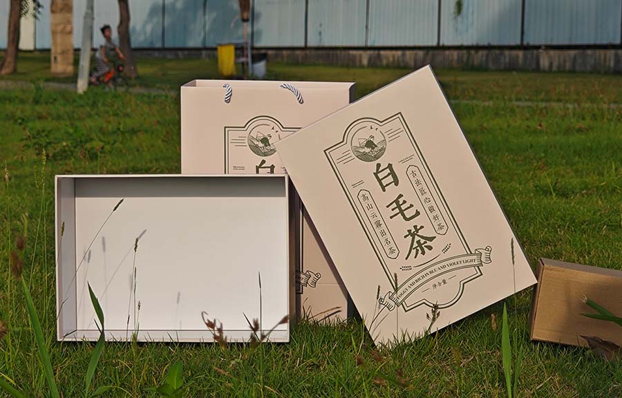 茶盒正面畫面排版采用中軸對稱式構圖,在傳統茶盒的設計基礎上推陳出新,利用黃、綠二色奠定畫面沉穩古樸的色彩基調,融入茶農手工采茶的場景元素,緊緊圍繞“高山云霧出名茶,古法匠心做好茶”這一概念,從而設計出緊貼大源鎮白毛茶文化特色的白毛茶盒。茶盒實體制作為天地蓋,質感高級,開啟具有儀式感,有利于提升茶葉產品形象,打造大源鎮白毛茶品牌獨具特色的茶葉形象。