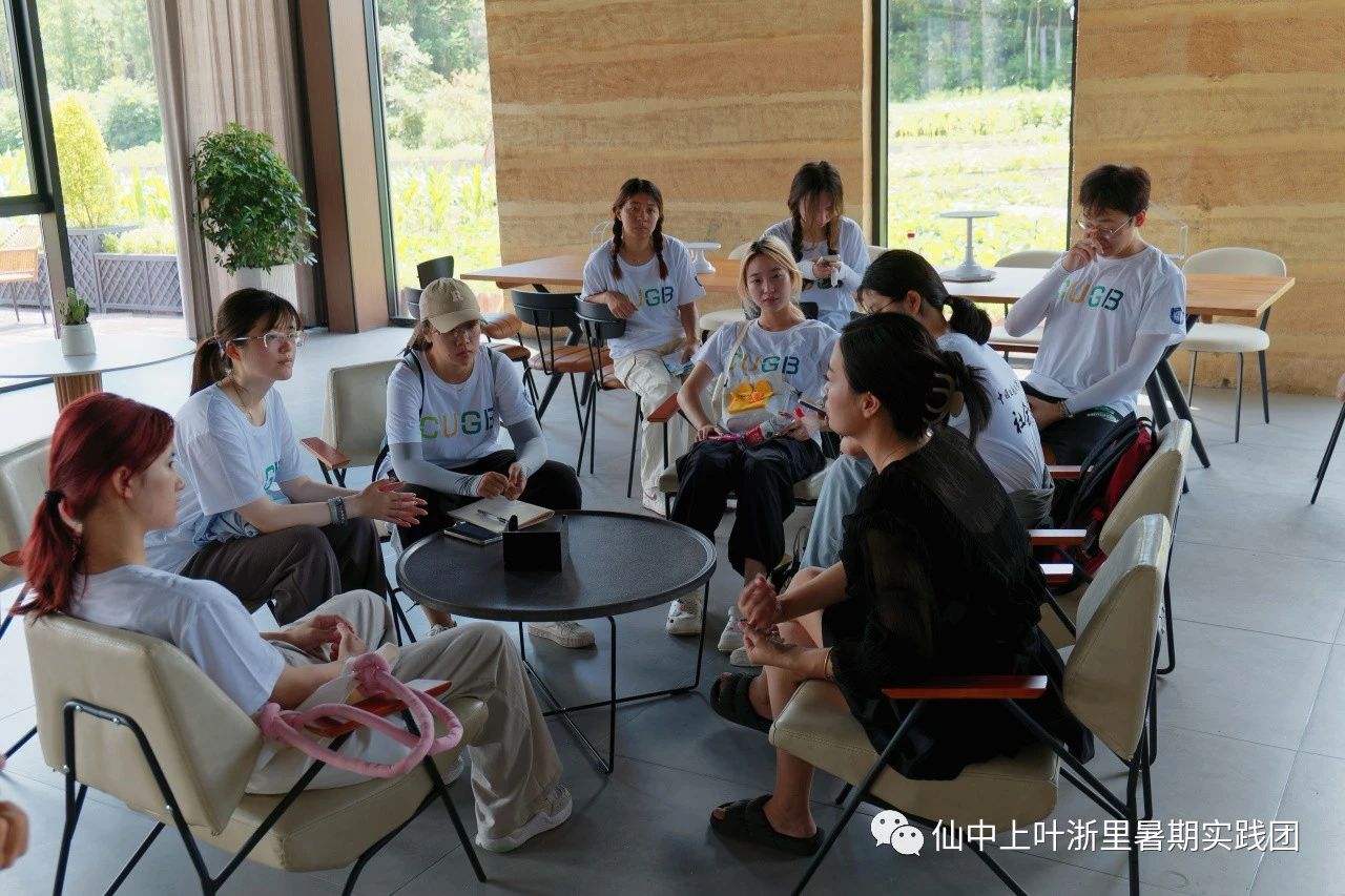 實(shí)踐團(tuán)的同學(xué)們就有關(guān)于上葉村目前產(chǎn)業(yè)相關(guān)就對村干部們提出了一些問題。其中,同學(xué)們很關(guān)心的一點(diǎn)便是上葉村的產(chǎn)業(yè)發(fā)展是否在其他村也有可推廣性。回答這個(gè)問題時(shí),村書記實(shí)事求是地強(qiáng)調(diào)了“因地制宜“這四個(gè)字。上葉村位于神仙居游客集散中心,高速路口出口不遠(yuǎn)處,交通便捷,人流量較大,因此民宿等一系列產(chǎn)發(fā)展市場大。同時(shí),通過借鑒鄰村已有的民宿改造成功經(jīng)驗(yàn),村民的轉(zhuǎn)變信心也大大增強(qiáng)。不僅如此,村領(lǐng)導(dǎo)班子還善于開拓思維,打破固有產(chǎn)業(yè)模式,推出農(nóng)旅新模式,孕育了一眾云上農(nóng)場(即個(gè)人承包,農(nóng)戶經(jīng)營,最終個(gè)人采收的模式)、“上葉來信“等新新產(chǎn)業(yè),為村民經(jīng)濟(jì)收入的可持續(xù)發(fā)展保駕護(hù)航。與村支書交談過程中,他也屢屢展望上葉村的美好未來,用真心、創(chuàng)新繪就了一幅上葉村發(fā)展的嶄新藍(lán)圖。