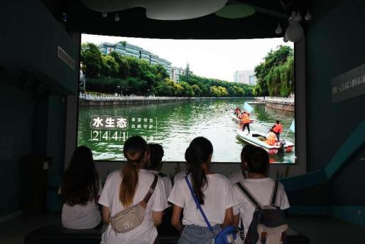 之后,貴陽市水務局相關工作人員為了讓我們更好地體會分布式下沉再生水生態系統的優勢,帶領實踐隊成員前往青山再生水廠地上的水環境科普館。在水環境科普館內,講解員為隊員們詳細介紹了貴陽市的水資源產業的地標性建筑、貴陽市水治理現狀以及節約用水的重要性,為實踐隊后續探尋水與旅游產業結合發展規律奠定了知識基礎。值得強調的是,整個科普館建設在水廠地面空間附近,有利于因地制宜、使資源利用達到最大化。