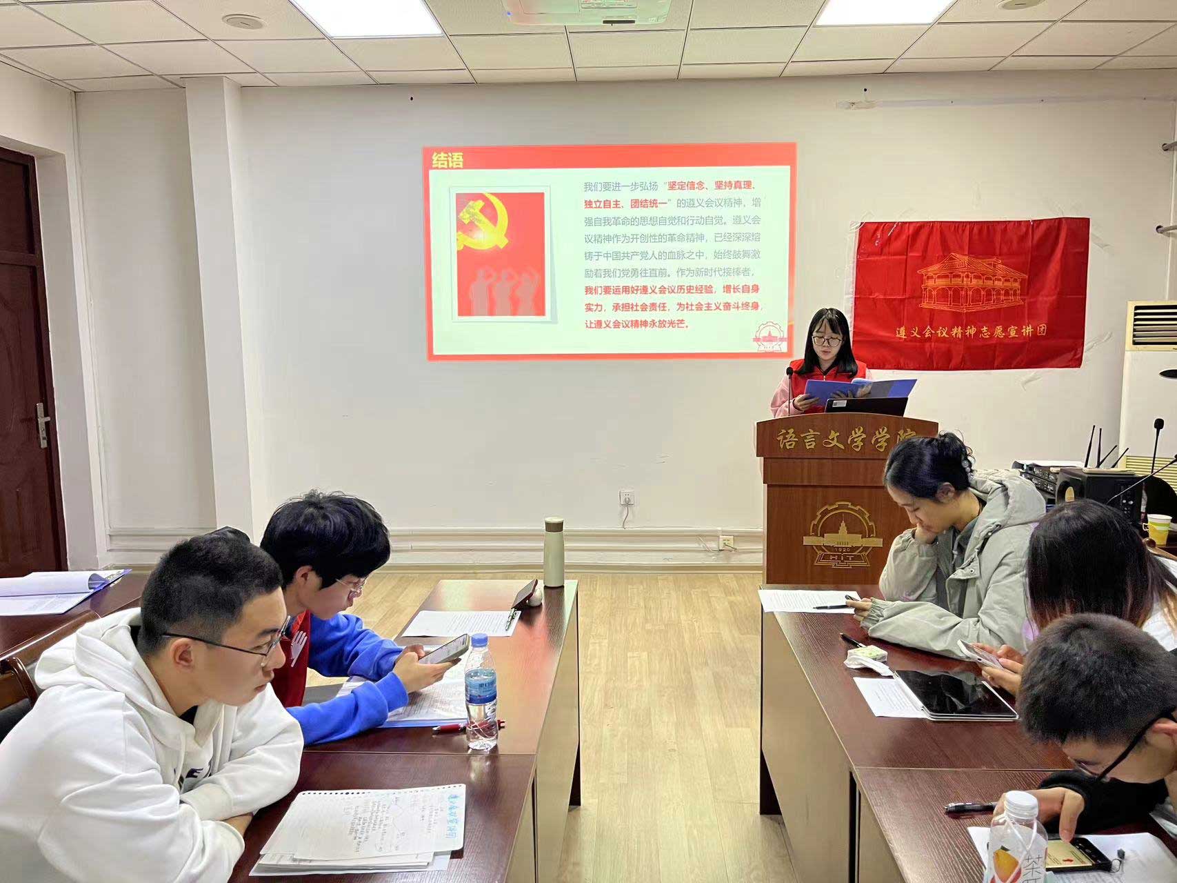 12月14日晚,2023年全國大學生遵義會議精神志愿宣講團、哈爾濱工業大學(威海)“語”黨同行走入哈工大(威海)學生團支部開展宣講活動。活動由哈爾濱工業大學(威海)語言文學學院團委書記張凱主持,語言文學學院2305101、2305102、2305201、2305301團支部參加活動。