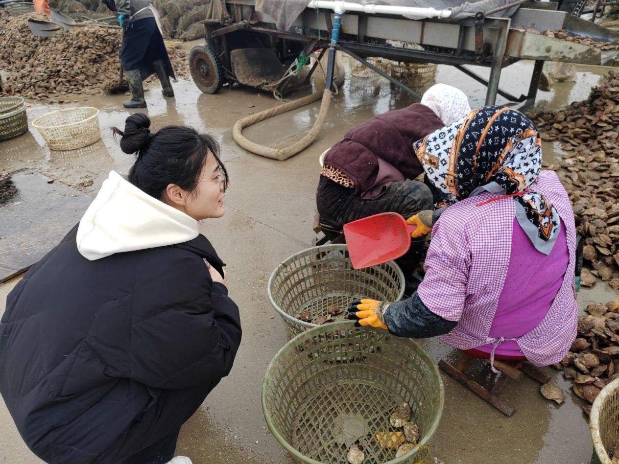 社會實踐隊隊員隨后來到任家臺村近海養殖區,這里是漁民們勞作的地方,他們依靠著海洋養育自己的家庭。我們有幸親眼目睹了捕魚的過程,感受到了勤勞漁民的辛勤付出。引入眼簾的多為裹著頭巾低頭挑揀牡蠣的婦女。據了解這些婦女多為來自任家臺村鄰村的居民,他們大都騎著自己的電動車來該村務工,任家臺村的漁業發展為該村及周圍村子提供了大量的就業機會。在調研的過程中,我們采訪到了近海養殖的負責人,她向我們介紹到近海養殖投入的成本很高,需要一兩年才可以回本,同時每年都需要投入新的成本,今年因日本和污水排放,對齊近海養殖也造成了一定的影響,因害怕對牡蠣有影響,為避免損失所以今年養殖的牡蠣相應減少,在這個背景下,社區正在積極尋找可持續的發展路徑,包括拓展其他產業、環保措施等。同時隊員們了解到,從事近海養殖的人員大部分為任家臺村本村村民,但也有部分外村,可見任家臺村的養殖業也帶動了相鄰村子的經濟發展。社會實踐隊隊員觀察到,近海養殖主要養殖的產品為牡蠣、扇貝等,不同區域從事不同的工作,將牡蠣打撈上來后有工人進行挑選、沖洗、加工,形成完整的流水線工作,大大提高了工作效率與產品品質。