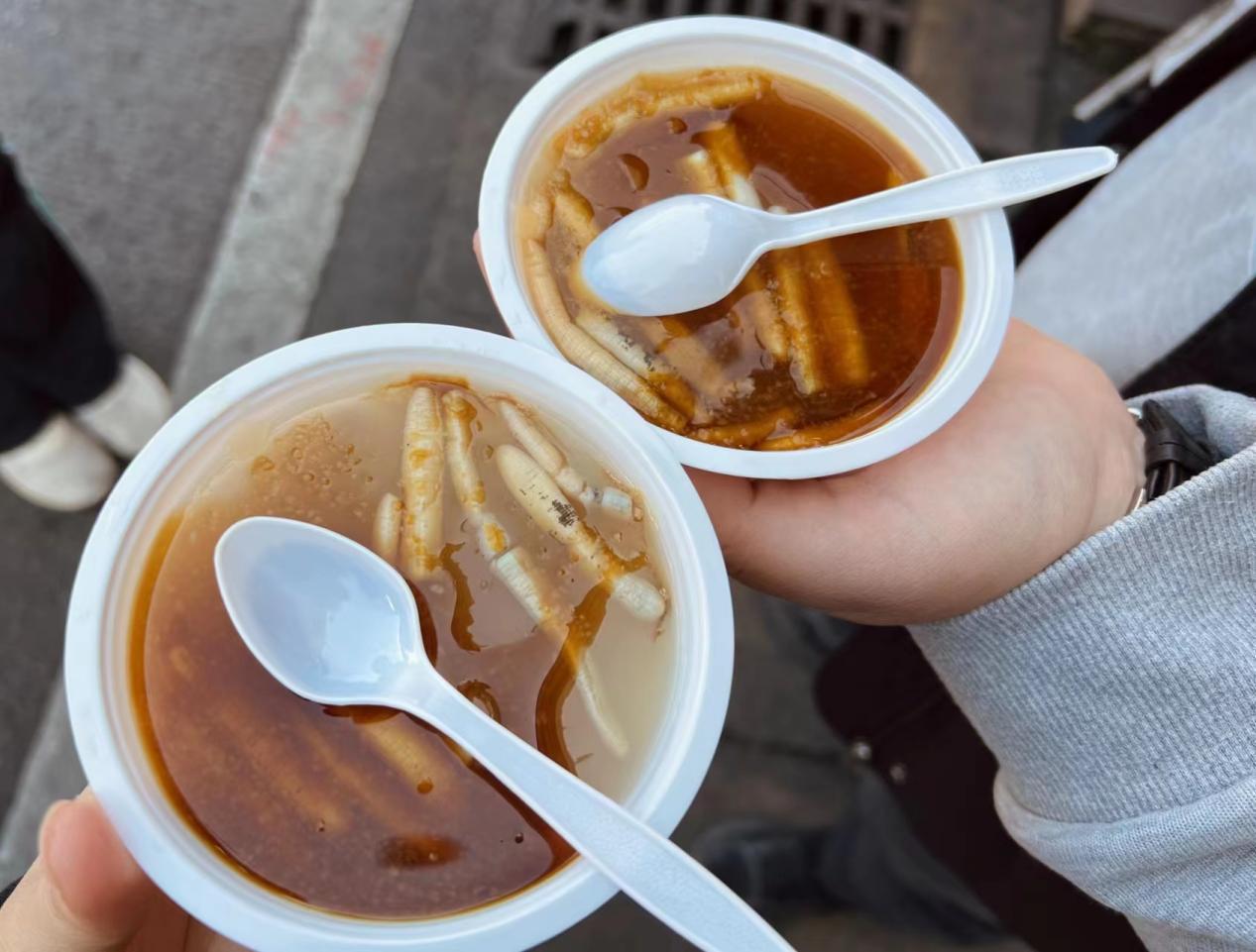 土筍凍,土筍富含膠質(zhì),冷卻后成果凍狀,晶瑩透亮,有清肺補虛、活血強身的功效,是一種不可多得的美食。