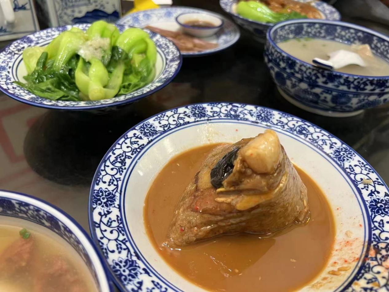 第一站,實踐隊來到了“侯阿婆燒肉粽”品嘗泉州特色小吃。泉州肉粽制作技藝,于2013年被列入泉州市第四批非物質(zhì)文化遺產(chǎn)保護名錄。“燒肉粽”的特色在于“燒”,在閩南語中“燒”取“熱”之意,即肉粽要趁熱吃。肉粽以糯米為主食,中間裹以五花肉、雞蛋、香菇等餡料,經(jīng)粽葉包成“四面體”狀,蒸煮后配以甜辣醬或花生醬食用。為了使肉粽符合大眾口味,老板保留了原有風味,并加入蓮子、板栗、蝦仁、干貝、鮑魚等閩南特色干貨,讓食客剝開兩片粽葉便賞味萬里山海。為打開“老字號”走出去的大門,他們結(jié)合現(xiàn)代信息傳播媒體,展示泉州“燒肉粽”的品質(zhì)以及傳承的真心,將肉粽品牌推廣到主流電商平臺,為傳統(tǒng)肉粽尋找新的生機。