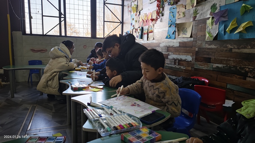 Figure 2圖為實(shí)踐隊(duì)員在陪伴和引導(dǎo)孩子們作畫。山東大學(xué)生命科學(xué)學(xué)院"以畫療心,撥云開(kāi)霧" 公益實(shí)踐團(tuán)隊(duì)通訊員 李薇 攝。