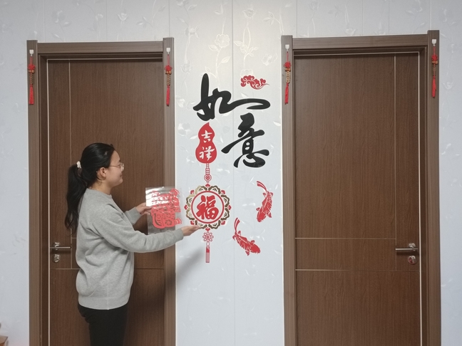 實踐隊員幫助居民貼窗花。 中國青年網(wǎng)通訊員 王雪麗 供圖