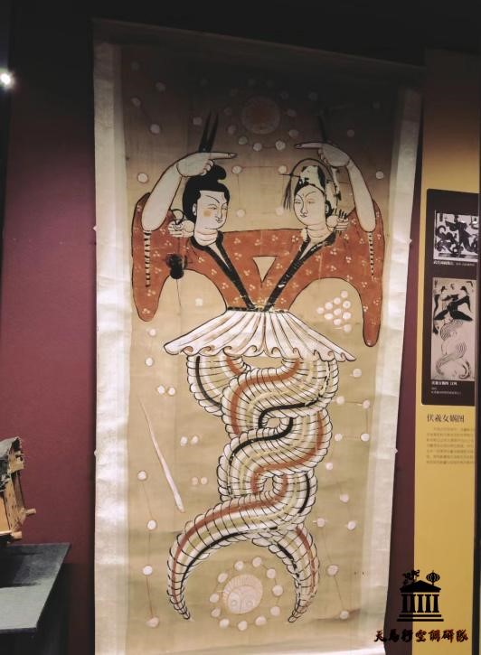 為進(jìn)一步了解神話對中國古代生活和思想的影響,加深對華夏文明、中國古代神話的理解,探尋在民族文化背景下,中國神話的體現(xiàn)及其發(fā)展過程。2024年2月23日,山東大學(xué)(威海)天馬行空團(tuán)隊前往新疆維吾爾自治區(qū)博物館進(jìn)行實地探訪。在負(fù)責(zé)人的安排下,本團(tuán)隊跟隨講解員重點參觀新疆歷史文物展和新疆古尸展覽,關(guān)注探尋中國古代神話在文物上的體現(xiàn)。如這幅吐魯番阿斯塔那墓出土的《伏羲女媧圖》。以白、紅、黃、黑四色描繪,人首蛇身,伏羲左手執(zhí)矩,女媧右手持規(guī)。二人上體相擁,下體相纏,是中國傳說中的始祖神。