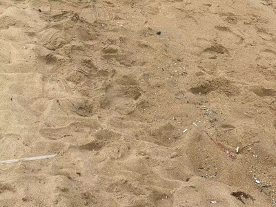 調查伊始,團隊成員白沙門沙灘及其附近海域的垃圾污染情況及垃圾種類分別進行了實地調研。沙灘潔白,海不揚波,該片海域的沙灘垃圾較少,整體比較干凈,而且并沒有看見環衛工人在清掃垃圾,有專用的垃圾桶進行收集垃圾,可見當地居民和游客的素質是整體比較高的。沙灘整體平整,但海邊部分下陷嚴重,基本無植被覆蓋,但有部分巖石。巖石部分有一些不明絲線,但無其他垃圾。垃圾主要出現在沙灘上,沙灘上的垃圾種類主要是煙頭、煙花爆竹殘骸和包裝紙、口罩和紙屑等一些細微垃圾,還有見到一個礦泉水瓶和一個大紙殼,但大型垃圾出現很少。