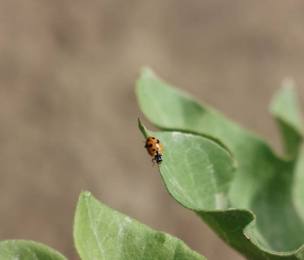 星火實踐小隊隊長聶磊在下地觀察棉花長勢時發現了葉子上爬行的瓢蟲,張福生笑著談到:瓢蟲不吃棉花,瓢蟲是益蟲,瓢蟲吃蚜蟲,葉子上黑黑一片的是蚜蟲,有瓢蟲說明除蟲措施做得還是比較好的。