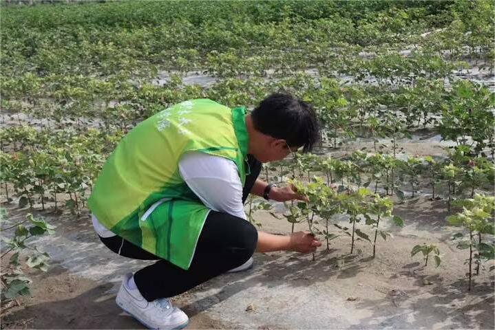 7月6號上午,星火實踐小隊在十二團十一連農戶張福生的56號棉花地里開展實地調研活動。