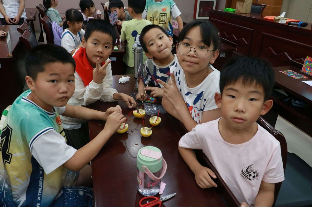 在“家用電池的設(shè)計(jì)與制作”課堂上,小朋友們在21機(jī)自1班顧天樂的帶領(lǐng)下學(xué)習(xí)了水果電池的制作方法,他們將銅釘和鋅釘插入水果中,小朋友們將LED的引線纏繞在銅釘和鋅釘上,并使用電工膠帶固定。當(dāng)一切準(zhǔn)備就緒后,他們滿懷期待地連接了電路。隨著電路的接通,一盞盞LED燈在學(xué)生們的手中亮起,教室里頓時充滿了歡呼聲和驚嘆聲。小朋友們興奮地交流著各自的實(shí)驗(yàn)成果,并嘗試通過串聯(lián)多個水果電池來增加電壓和亮度。