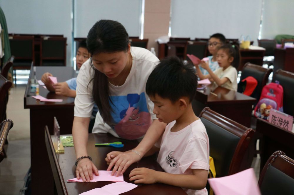 伴隨著刮畫課程的濃厚藝術(shù)氛圍,22媒體技術(shù)1班胡玙樂的剪紙課程拉開帷幕。“花花”老師介紹了關(guān)于剪紙文化的相關(guān)知識,孩子們跟著視頻和22媒體技術(shù)1班胡玙樂的教學(xué),制作出了一朵漂亮的小花,雖然中途經(jīng)歷了些許波折,但是在助教老師們耐心的指導(dǎo)下,孩子們基本全部完成了制作。