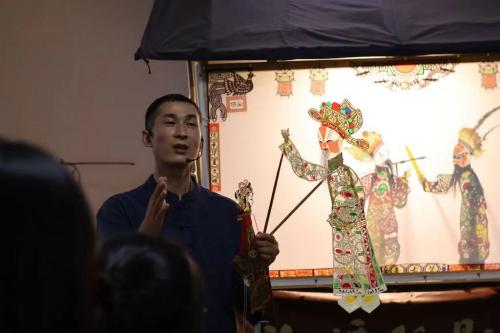 “你永遠(yuǎn)不可能真正了解一個人,除非你穿上他的鞋子走來走去,站在他的角度考慮問題”,所謂紙上得來終覺淺,絕知此事要躬行。為進(jìn)一步了解紙影戲的準(zhǔn)備工作以及表演過程,團(tuán)隊成員們在吳淵先生的幫助下,親身體驗了簡化版紙影人偶的制作,從掰取人偶部件,借助釘子組裝拼接人偶關(guān)節(jié),到利用錘子、鉗子加固和操作人偶,一步一個腳印,切身體會制作紙影人偶的過程。在兩位傳承人精彩的“吹胡子瞪眼”“關(guān)公戰(zhàn)秦瓊”表演后,團(tuán)隊成員們也開展了即興的對戲表演,增添了現(xiàn)場的歡樂與愜意。躋身于小小的后臺,一個人兼具人偶的動作變換和各類樂器的配合,在光與影的對決中賦予人偶以靈魂生命,在明與暗的交接中盡情講述人偶故事,通過切身的體驗和嘗試,激發(fā)了大家對紙影戲的學(xué)習(xí)熱情,也使成員們真正感受到了紙影文化的無限魅力以及傳承的艱巨任務(wù)。