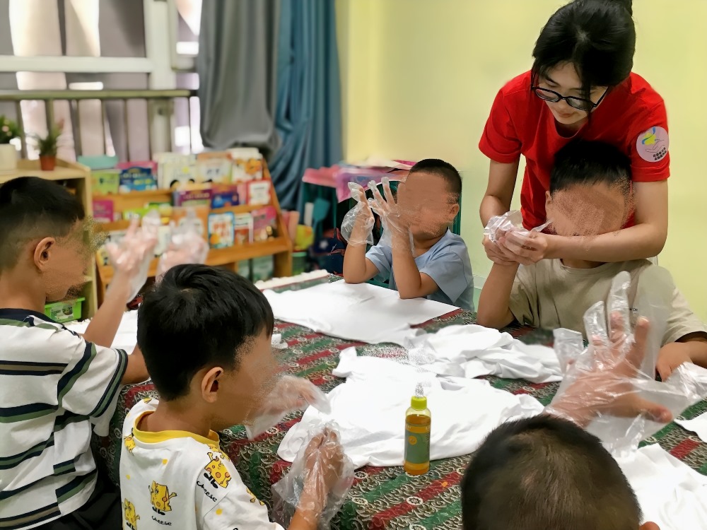 圖為“蓓蕾藍(lán)絲帶”學(xué)生志愿者扎染活動(dòng)的準(zhǔn)備工作。 李思瑩 供圖