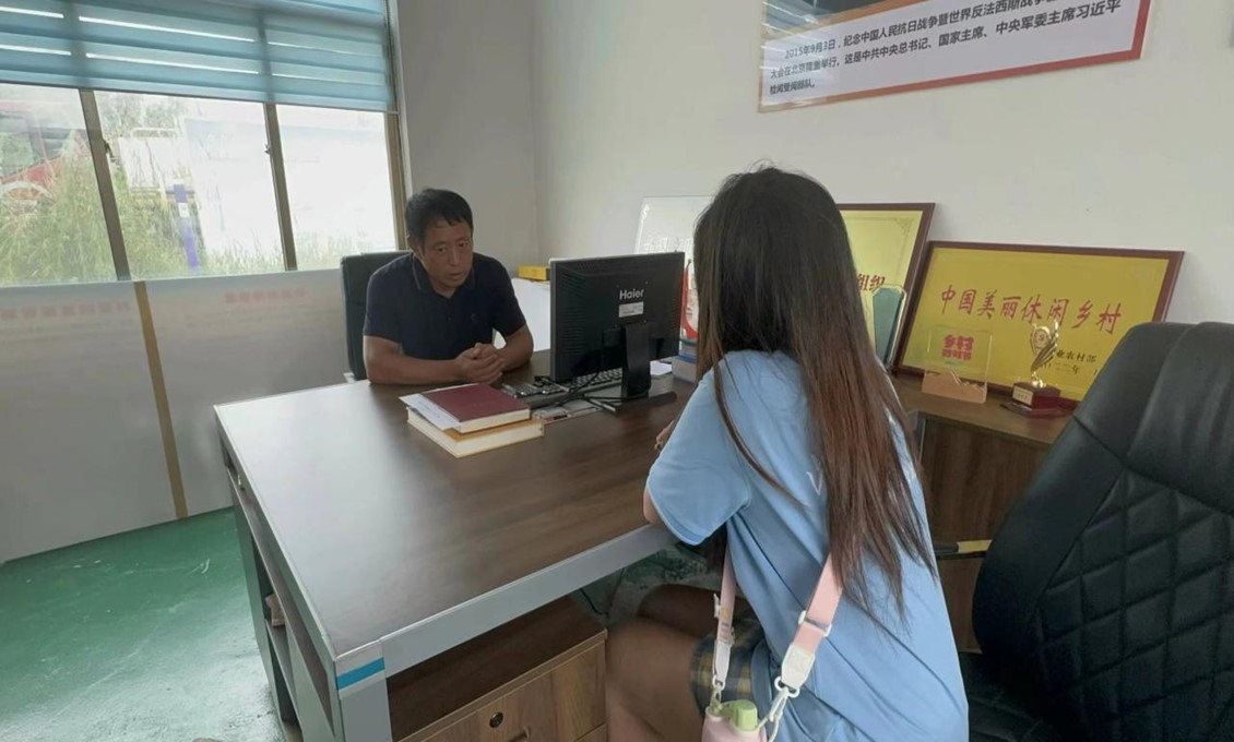 圖為“Min”能社會實踐團成員采訪蓑衣樊村村主任司國營