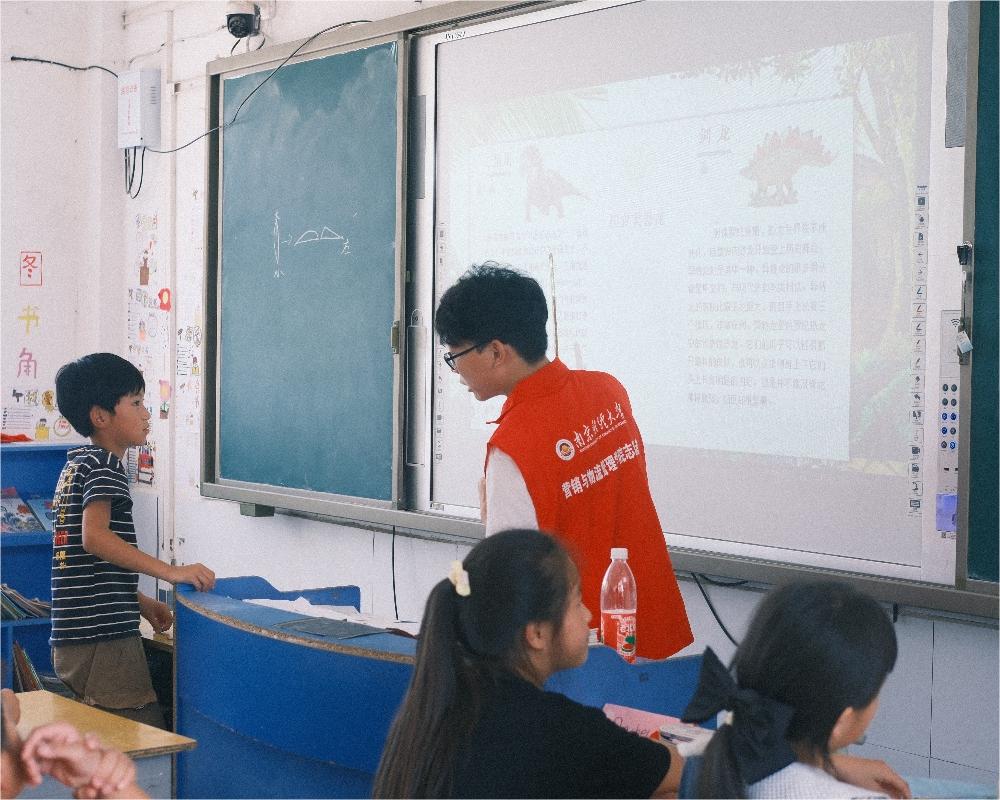 恐龍百科知識科普課堂上,志愿者們先通過《侏羅紀公園》電影片段激發孩子們對課堂的興趣,然后拋出一系列問題:“人類是怎么知道恐龍的存在?”,“第一次發現恐龍化石的時間是什么時候?”,“恐龍的種類有哪些?”孩子們爭先恐后地舉手回答問題,一口氣說出十幾種不同種類的恐龍,激烈地討論恐龍滅絕的原因,足以見得他們對科學的熱愛以及對生物的好奇。小老師從恐龍滅絕這一事件,呼吁孩子們要保護地球,愛護家園,不要讓人類成為下一個恐龍。
