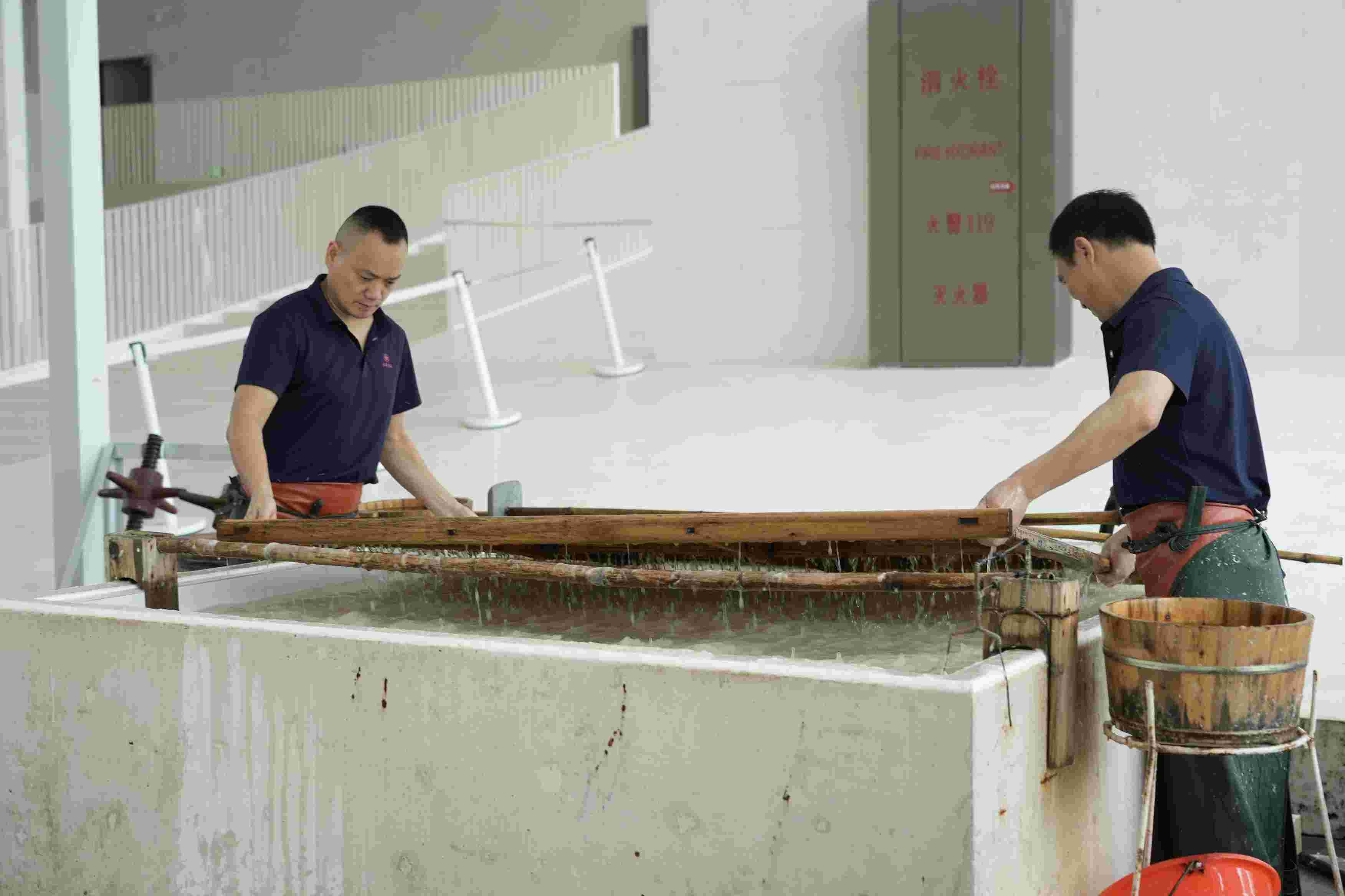 從一株樹到一張紙,宣紙的華麗蛻變每招每式都需要工匠們日積月累的精湛技藝。“水深火熱”是宣紙的兩大關鍵環節。“水深”就是撈紙,“火熱”則是曬紙。用竹篾編成的紙簾在漿水中上下左右搖晃,一撈一提、一深一淺,兩個撈紙工需要高度協調,才能保證每張紙的厚薄均勻、質量優良。通過講解員的細致講解與工作人員的現場演示,成員不僅了解了宣紙的制作工藝,還學習了如何辨別不同類別的宣紙。