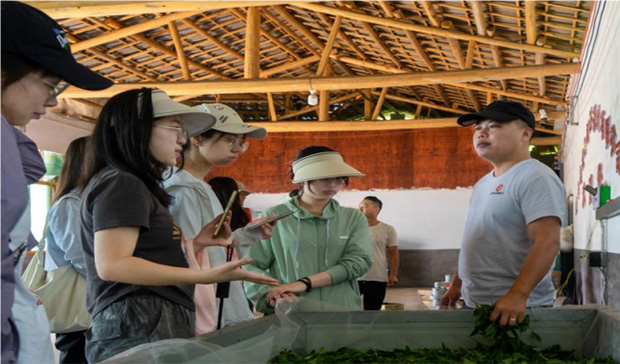 在綠意盎然的茶廠內,朱老板以飽滿的熱情向實踐團成員們詳盡闡述了從枝頭嫩葉到市售佳茗的蛻變過程,以及同一茶葉如何通過精妙各異的制作工藝,綻放出不同品種的獨特韻味。從晨光中的細心采摘,到殺青鎖鮮的關鍵一步,再到脫毛、炒干以去水分、提香增色,直至最終成品包裝的精心打造,每一道工序都蘊含著長田村茶農們對自然饋贈的敬畏之心與不懈追求。成員們親眼目睹了這一過程,深刻感受到每一片茶葉都不僅僅是大自然的恩賜,更是長田村農民用汗水與智慧精心雕琢的藝術品。這些茶葉,承載著長田村人的勤勞與夢想,跨越重重山巒,成為了連接這片偏遠土地與廣闊世界的橋梁,不僅豐富了市場的茶葉種類,更讓長田村的名字隨著茶香遠播,成為了一張閃耀的鄉村振興名片。