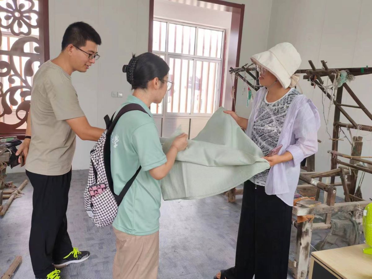 李屋村村委會成員向實踐服務團成員們介紹當地的非遺文化產品——老粗布,重點說明老粗布是由純天然棉紡線制成,具有透氣和吸濕的特點,主要被制作成床單和枕套等床上用品,能夠為人們提供舒適的睡眠體驗。村委會成員特別指出,受限于銷售渠道輻射能力弱、人工制作成本高、市場定位不明確、宣傳營銷力度欠佳等問題,導致這一非遺文化產品的推廣面臨挑戰,希望實踐服務團成員們能夠利用青年思維,凝聚年輕一代的創新精神和活力,為老粗布的宣傳發展擴寬視角。村委會成員帶領實踐服務團成員們前往由李屋村為民合作社打造的“巾幗創業基地”——“匯絹紡”,實踐服務團成員們通過親身操作,體會到從選線、染色到織造等每一個步驟的繁瑣與精細,同時被織布工藝所展現的工藝美學和匠心精神等獨特魅力所吸引,認識到加強老粗布宣傳工作的必要性,通過打造具有地方特色和文化內涵的老粗布品牌來促進這一傳統手工藝的傳承與創新,讓更多人了解并欣賞到這一古老技藝的時代價值。