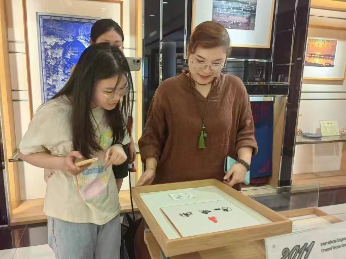 最后,實踐團成員對何老師進行了專訪。何雅雯老師在中國美術學院深造后,跟隨金壇刻紙大師楊兆群學習,技藝日益精進。她不僅傳承經典,更勇于創新,其中,在江蘇省首屆鄉土人才傳統技藝技能大賽刻紙項目中,一個“春暖花開”為主題的刻紙深深打動了評委的心——“深紫色宣紙打底,桃紅色紙描繪景物,銀色紙刻畫人物,刻紙栩栩如生,別具一格,贏得了該項目一等獎。”由于她大膽創新,被破格認定為“高級工藝美術師”,并榮獲“江蘇省巾幗建功標兵”稱號,她的作品不僅受到業內人士的高度評價,也贏得了廣大觀眾的喜愛。何老師積極推廣刻紙藝術,通過展覽、培訓等方式吸引更多人關注。展望未來,她信心滿滿,誓為金壇刻紙的傳承與發展貢獻力量,讓這一傳統藝術綻放更璀璨的光芒。