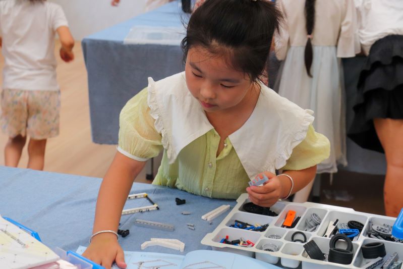 到了下午的自由活動時間,積木成了孩子們的新寵。實踐團的成員們帶來了各式各樣的積木,從簡單的拼接到復雜的結構搭建,小學生們展現出了驚人的動手能力和團隊協作精神。在一片片色彩斑斕的積木堆砌中,孩子們的想象力得到了充分的發揮,他們搭建起了屬于自己的小小世界,而實踐團的成員們則在一旁默默支持,偶爾給出一些建議,幫助孩子們克服難題。
