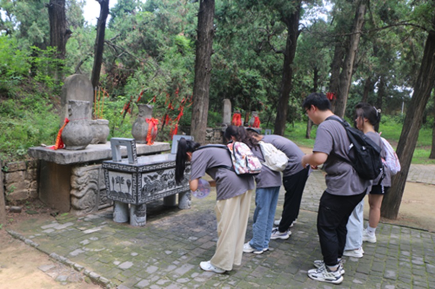 東坡碑林,一塊塊碑刻猶如歷史的豐碑,銘刻著蘇東坡的傳世經典。當代著名書法家們用靈動的筆觸,賦予了這些作品新的生命與靈魂,讓學子們沉醉于書法藝術與文學魅力的交織之中。而在三蘇陵園,實踐團成員懷著無比崇敬的心情,在墓前默默肅立。他們深知,三蘇父子不僅是文學的巨匠,更是中華民族智慧與精神的象征。