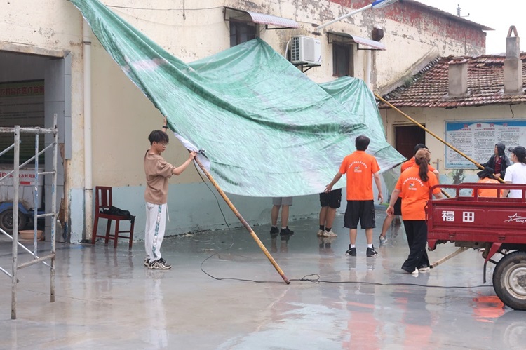 然而,在繪畫過程中,白水縣連續降雨,給繪制工作帶來了極大的挑戰。但村民們的熱情支持成為了實踐團前進的動力與保障,他們主動為實踐團成員搭建雨棚,為繪制工作創造了有利條件。實踐團成員們也毫不懈怠,身著雨衣,團結協作,在雨中連續作畫,始終保持著較高的工作效率。
