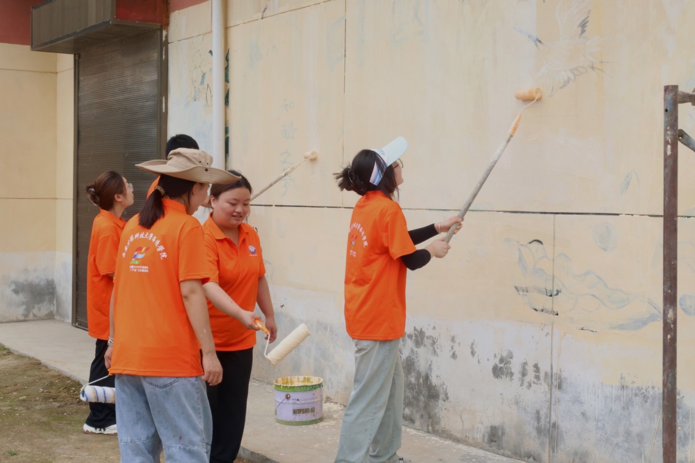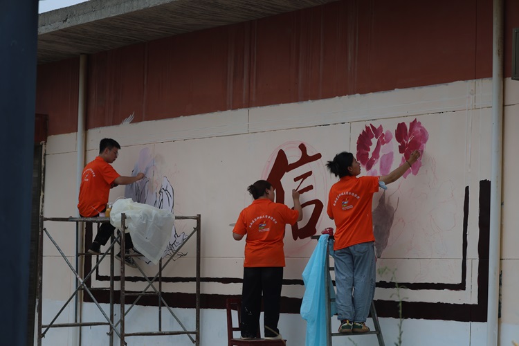 在墻繪創(chuàng)作過程中,天公不作美,大雨傾盆而下,但這并未澆滅實踐團成員們的熱情與決心。雷牙村第二黨支部書記申金良和村民們紛紛伸出援手,為此次墻繪活動做好后勤保障,給予了團隊極大的支持與幫助。他們幫忙搬運顏料、協(xié)助搭建腳手架、雨棚,在夜晚幫成員們撐起一盞明燈,場面十分溫馨。他們還表示:“這是我們自己的家鄉(xiāng),能為家鄉(xiāng)的文化建設(shè)出一份力,我們感到非常自豪。”