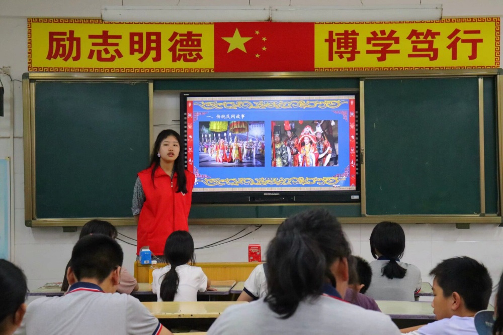 圖為志愿者講述傳統民族故事。 玉珍 攝走入課堂的一大亮點——民族藝術,志愿者為學生們展示了獨特的衣裝服飾、悠揚動人的民族,強節奏力的舞蹈,無不體現出各族人民的智慧和創造力。志愿者教唱學生們當地歌曲,洋溢著喜慶與歡樂的藏語歌使現場的氣氛再度推向高潮,而布依語版的《我在貴州等你》更是調動了學生的情緒,萌生出“去貴州看一看”的想法。學生和志愿者們共同唱響民族旋律,感受著這份“千里來相聚”的美好情誼。