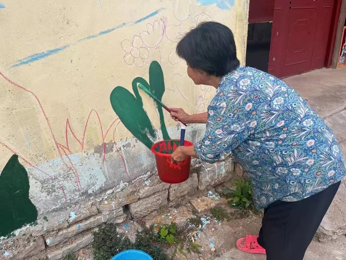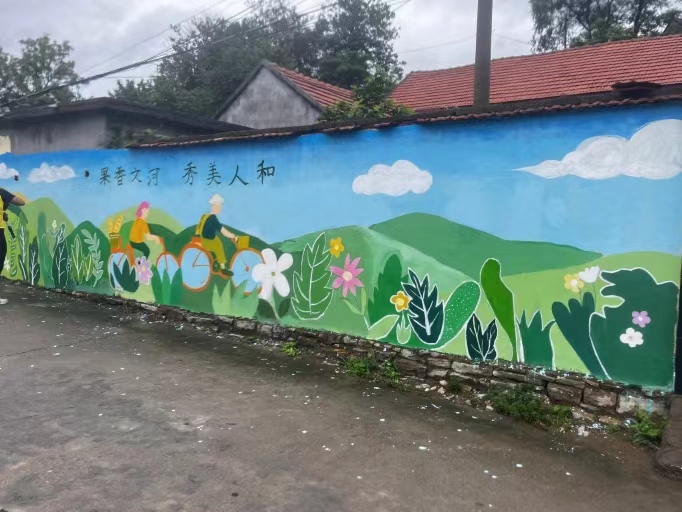 團隊成員在村民們的熱情歡迎下,開始了墻面彩繪工作。大家分工明確,有條不紊地進行著。有人負責打底,有人負責描繪細節,還有人負責顏色搭配。盡管天氣炎熱,但大家的熱情絲毫不減,紛紛揮灑汗水,為村莊增添色彩。村民們對墻繪表現出極大的興趣和熱情,紛紛駐足觀看,并與團隊成員互動交流。有些村民還主動加入到墻繪工作中,共同參與到美化家園的行動中來。