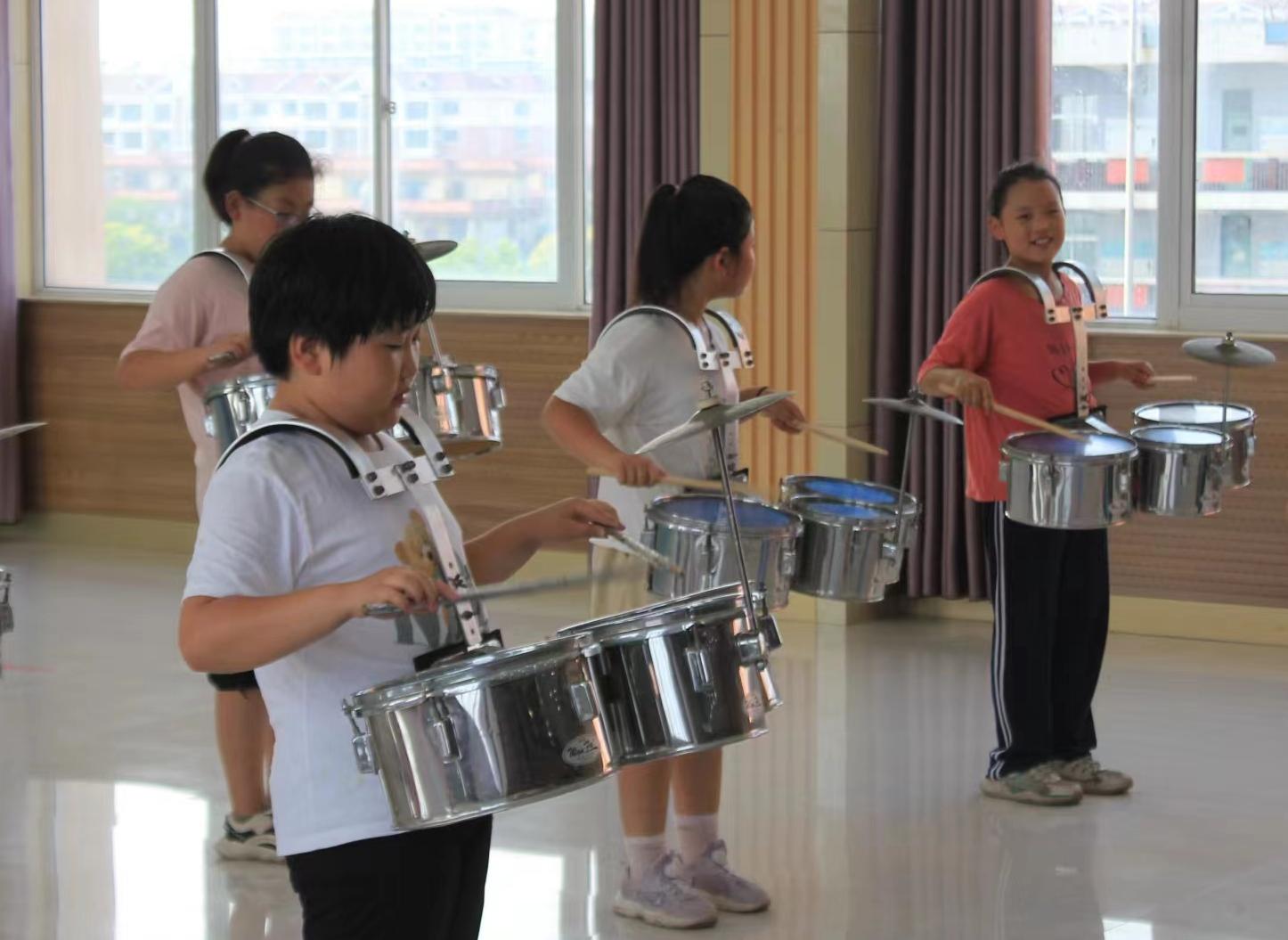鼓點鏗鏘,號聲雄壯。實踐團成員們踴躍協助音樂老師展開鼓號隊教學活動,他們開創性地運用了“高年級幫扶低年級、一幫一”的教學模式,既彰顯了高年級學生的榜樣力量,又推動了低年級學生的迅速成長。節奏銘記于心,旋律掌控于手,鼓號隊的訓練滿溢著激情與力量。實踐團成員們與孩子們一同直面挑戰,從基礎的樂理知識至復雜的演奏技巧,逐步深化。一次次的反復,一次次的磨合,一支初顯規模的鼓樂隊已然成形。