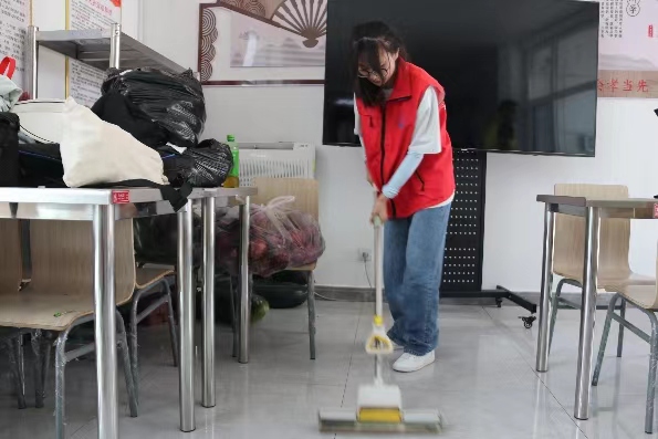 圖為團(tuán)隊(duì)成員幫助打掃衛(wèi)生