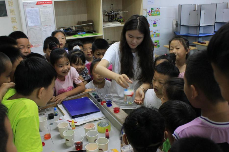 我們的未來,必定需要科學的領航指引。為使孩子們能夠在細致觀察中敏銳地發(fā)現(xiàn)科學規(guī)律,并實現(xiàn)于現(xiàn)實生活中的學以致用,實踐團成員李甜甜以“奇妙的化學反應”為主題,精心打造了一堂獨具匠心的化學實驗課。本次實驗課,實踐團成員籌備了兩項妙趣橫生的化學小實驗,“絢麗彩虹瀑布”和“俏皮淘氣的小紙團”。借由這些精彩的小實驗,充分激發(fā)孩子們對于未知事物的強烈求知欲與不懈探索欲,帶領孩子們勇敢地踏入未知的科學領域,一同探尋隱藏在化學世界中的普遍規(guī)律。課堂一開始,實踐團成員李甜甜引領同學們針對一些變色實驗的原理展開分享交流。同學們紛紛踴躍發(fā)言,積極闡述自己所認知的反應,諸如紅色與藍色相互融合會形成紫色,黃色與藍色彼此混合能夠變?yōu)榫G色等。這一問題猶如投入湖面的石子,激起了同學們思維的層層漣漪,引發(fā)了大家廣泛而熱烈地討論。