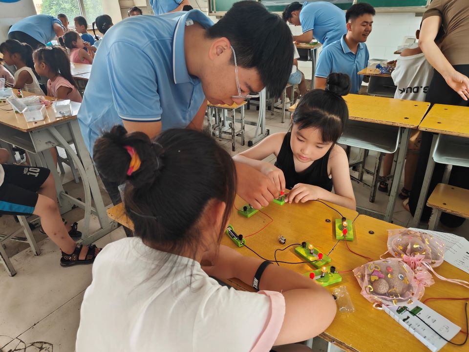 弘揚科技之光,播種希望之種。隊員們精心設計“電路科普小課堂”,向小朋友們科普電學知識,開展電學實驗。隊員們首先借助圖片和實物展示相結合的方式,用簡單易懂的語言介紹基礎電學知識,讓孩子們對電子元件的種類及功能有了更直觀的認識。同時,志愿者們還耐心科普生活用電安全小知識,包括插座使用、電器操作、避免電擊等方面的常識,通過有獎競答充分調動小朋友們的積極性,讓現場氣氛熱鬧非凡。在動手實踐環節,小朋友們仔細聆聽實驗步驟和安全事項,認真進行實操演練。面對復雜的電路知識,他們迎難而上,嘗試各種新奇的電路連接方法,從點亮一個簡單的小燈泡,到熟練運用光敏電阻調節燈泡亮度,每個孩子的臉上都洋溢著自豪和喜悅之情。
